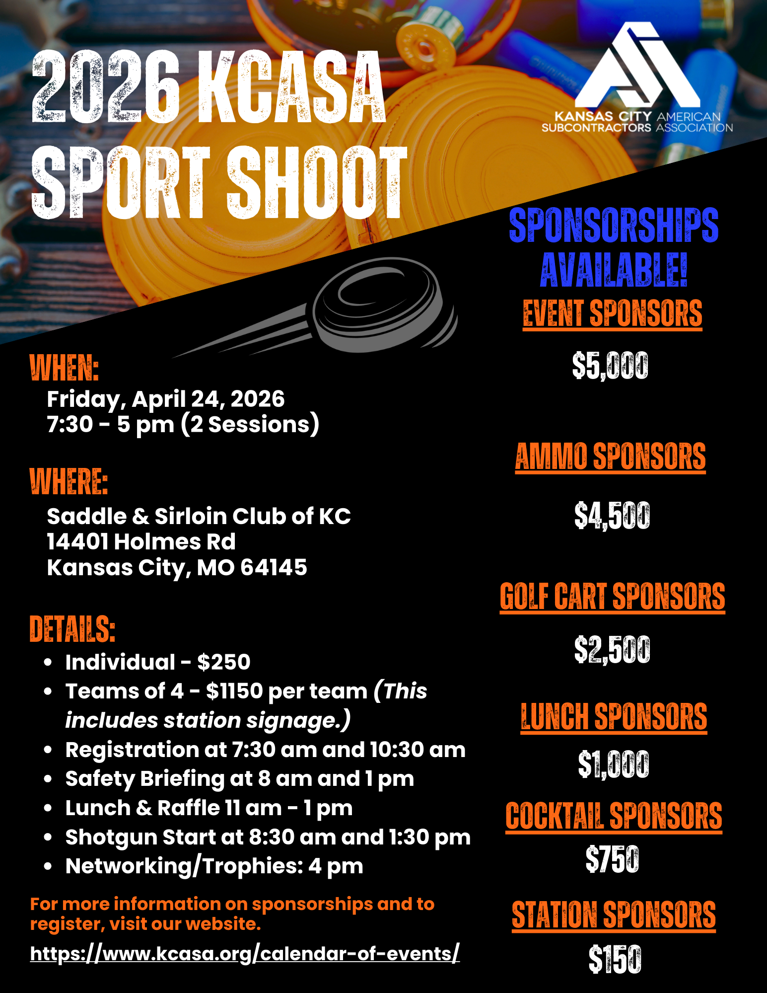 The 2026 Sporting Clay Shoot will be held at Saddle & Sirloin Club of KC in Kansas City, MO. Each team has (4) members. There will be 2 sessions - a morning session and an afternoon session. Each member of the team shoots 100 rounds at 12 stations. The object of the tournament is to have the highest number of broken clay targets for your team out of 400 targets. They have an open trap field for warm-up. The ammunition, golf carts, drinks, lunch, etc. are provided by KCASA as part of a team entry. NOTE: Please check the box on the registration form or email us at kcasa@kcasa.org and let us know if you are signing up for the morning session or afternoon session.